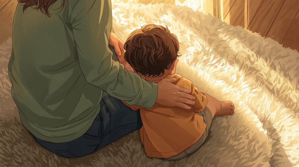 Canva AI prompt: “Warm cozy illustration of a young child snuggled under a soft chunky blanket in a calm bedroom, warm golden light from a bedside lamp, peaceful and comforting mood, muted greens and warm neutrals, no text, no faces clearly shown”