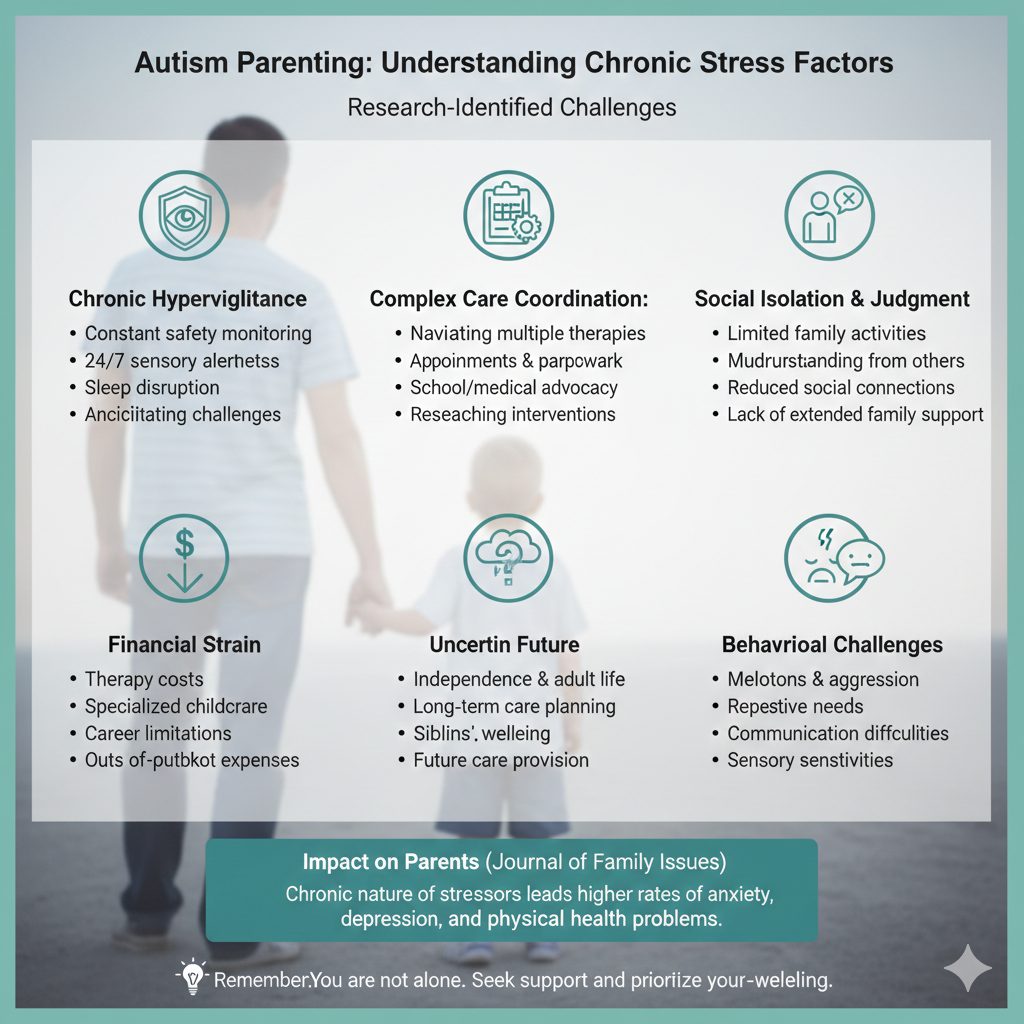 According to research in Journal of Family Issues, the chronic nature of these stressors—with no clear “endpoint”—contributes to higher rates of anxiety, depression, and physical health problems among autism parents compared to other parent groups.
